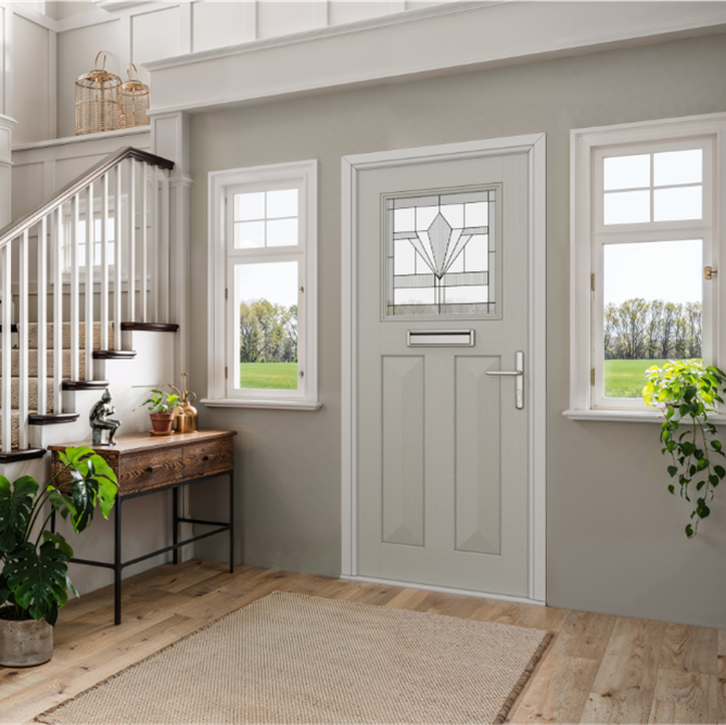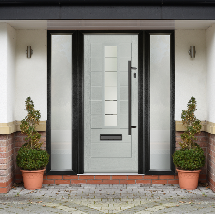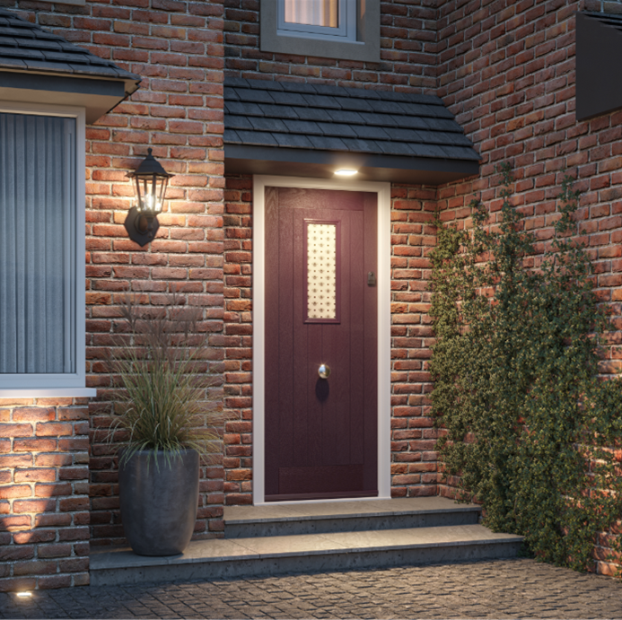 Composite doors in the Doorco reinforced GRP composite door slab. With a PU foam core, it significantly reduces heat loss while an LVL (Laminated Veneer Lumber) subframe delivers maximum stability.